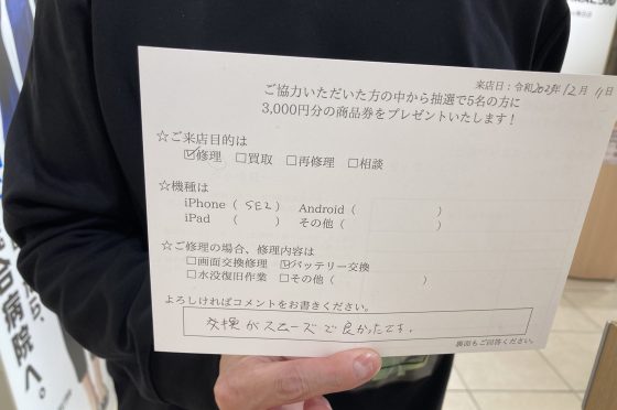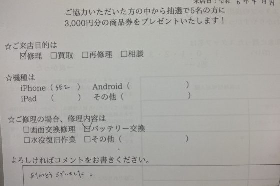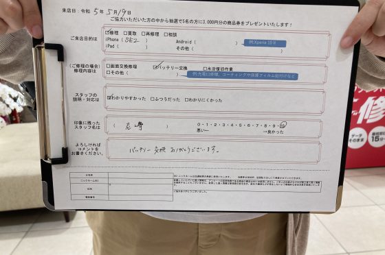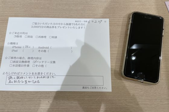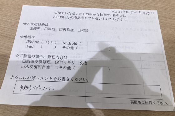 【お客様の声】大阪市よりお越しのお客様iPhoneSE2バッテリー交換させていただきました。