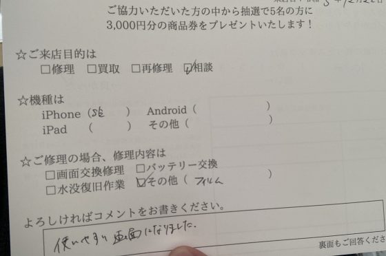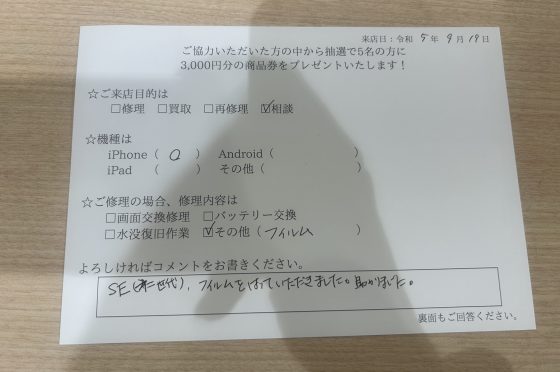 【お客様の声】大阪市よりお越しのお客様iPhoneSE2に画面保護の衝撃フィルム貼らせていただきました。