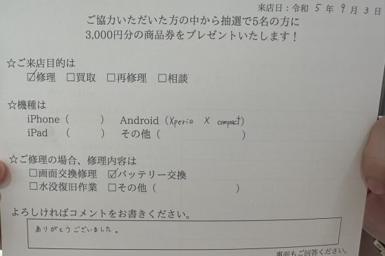 【お客様の声】Xperia X Compact のバッテリー交換をさせていただきました!