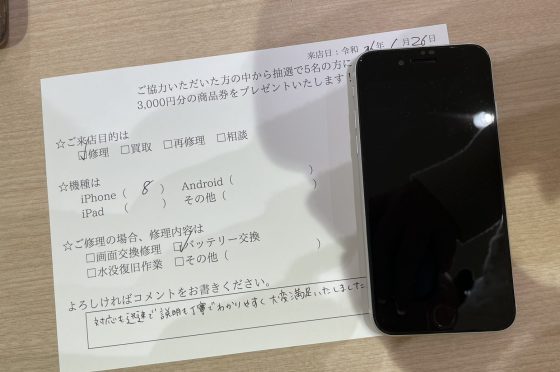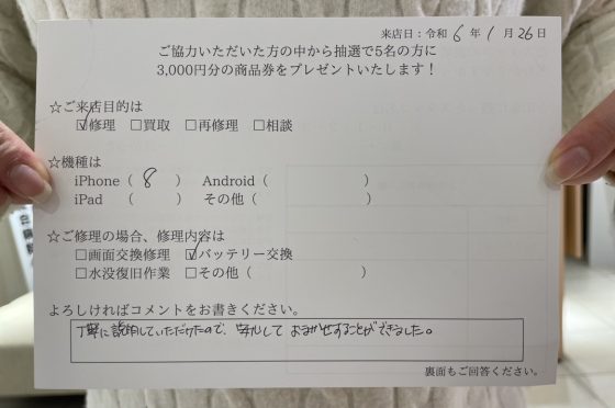 【お客様の声】iPhone8のバッテリー交換修理を承りました。