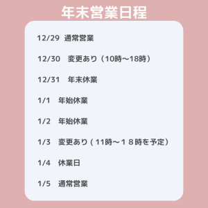 誠に勝手ながら、年末年始は下記の通り休業とさせていただきます。
