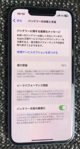 最大容量が78パーセントになっており、バッテリーの劣化が進んでいることが分かりますね