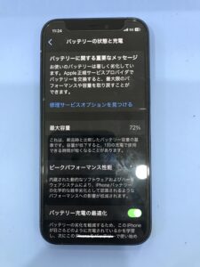 バッテリー最大容量(劣化具合の指標)が72パーセントとなっており、
