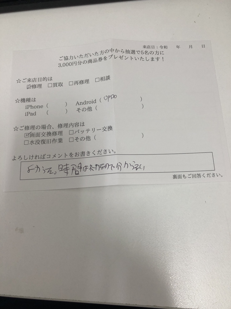 スマホスピタル藤沢 OPPOの画面交換ご依頼の方からコメント頂きました!