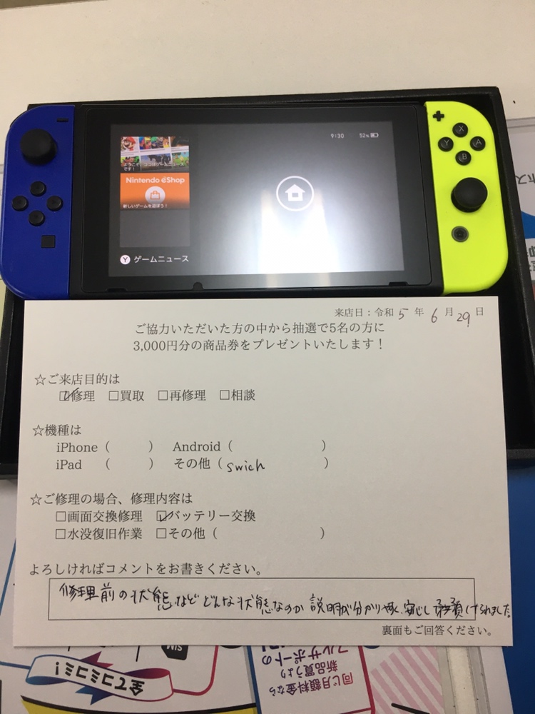 スマホスピタル藤沢 Switchのバッテリー交換致しました!