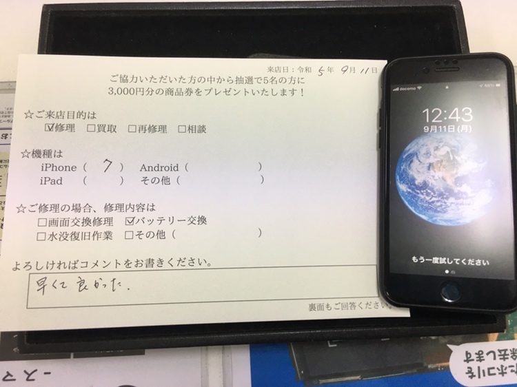 スマホスピタル藤沢 iPhone7のバッテリー交換致しました!