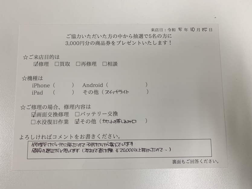 修理をしたら元に戻ったので、子供たちが喜んでいます。 値段の適正だと思います(本社で直した際¥20,000以上掛かったので)