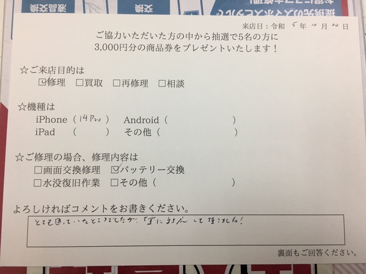 スマホスピタル藤沢 iPhone14Proのバッテリー交換致しました!