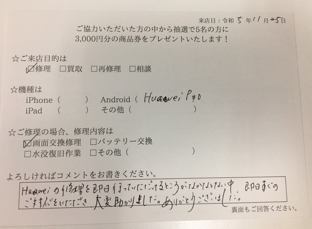 HUAWEIの修理を即日行っていただけるところがなかなかない中、即日すぐのご対応をいただき大変助かりました。ありがとうございました。