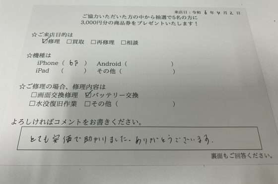 【iPhone6s】バッテリー交換をさせて頂きました!