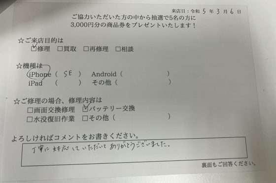 iPhoneSEのバッテリー交換をさせて頂きました!