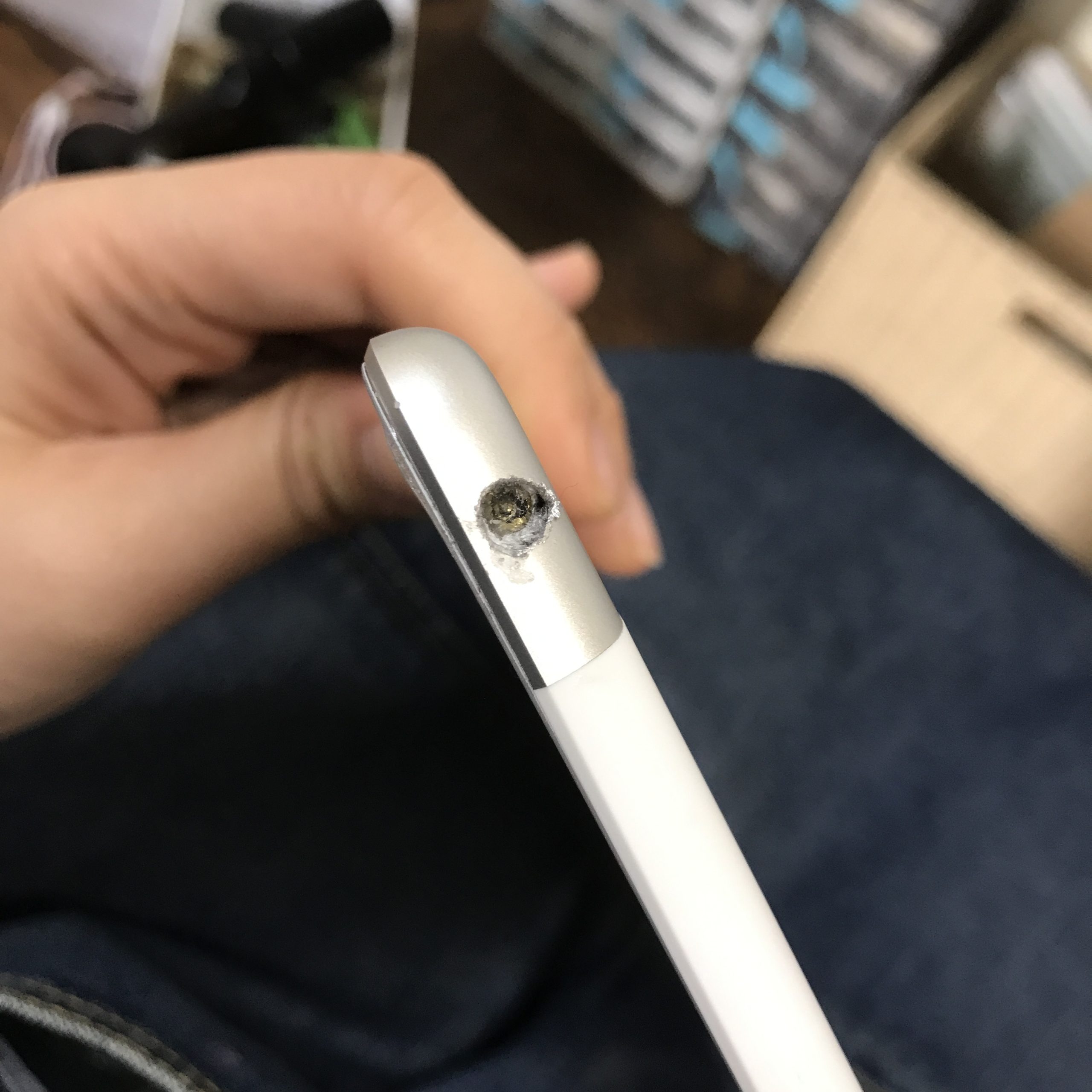 iPad8のイヤホンジャックにイヤホンの先端が折れてしまい、取れなくなってしまったということでご相談いただきました。イヤホンジャックのみならず、充電口にも破損した先端が詰まってしまうという方もいっしゃるようです。今回はマリノアシティがある福岡市西区からのご来店です。