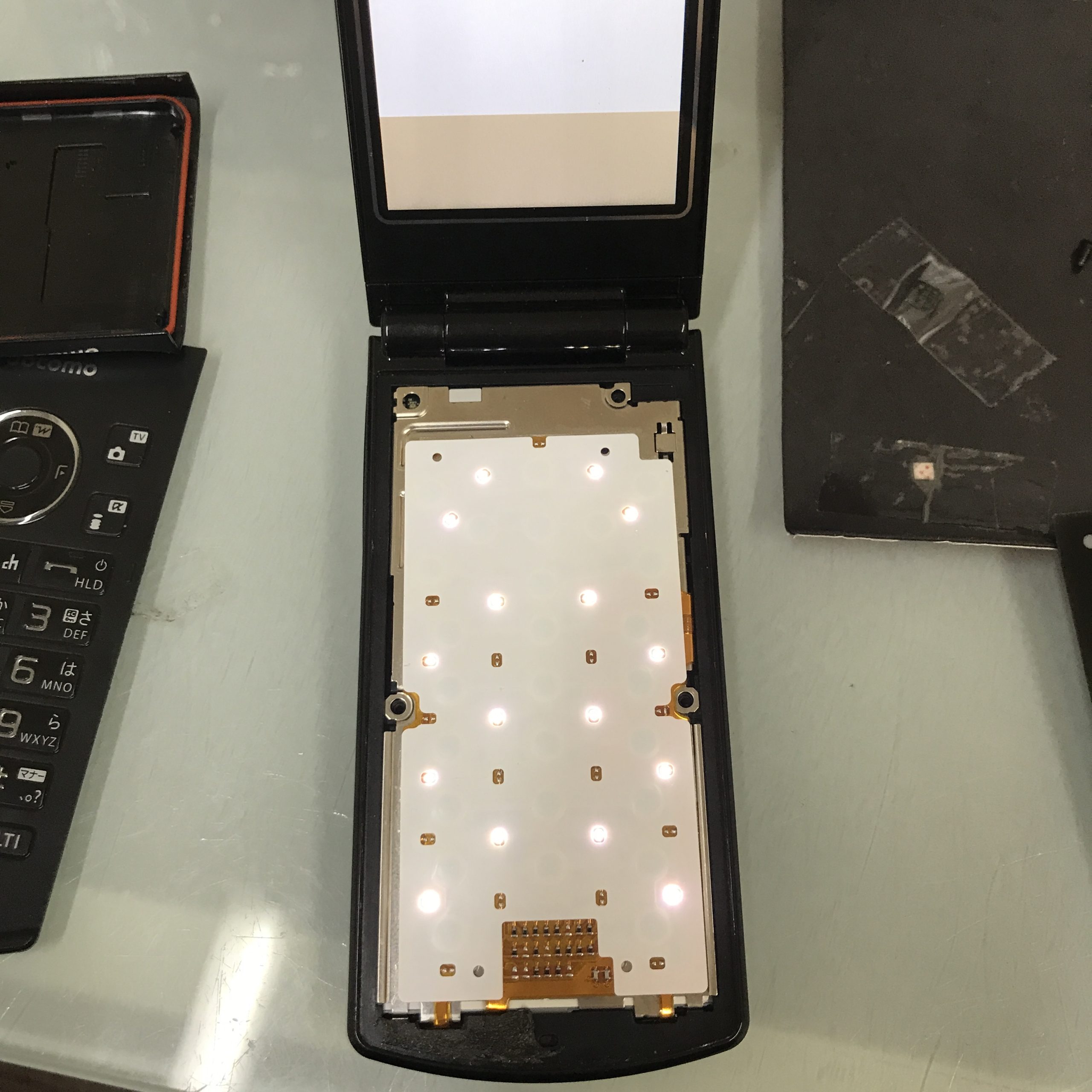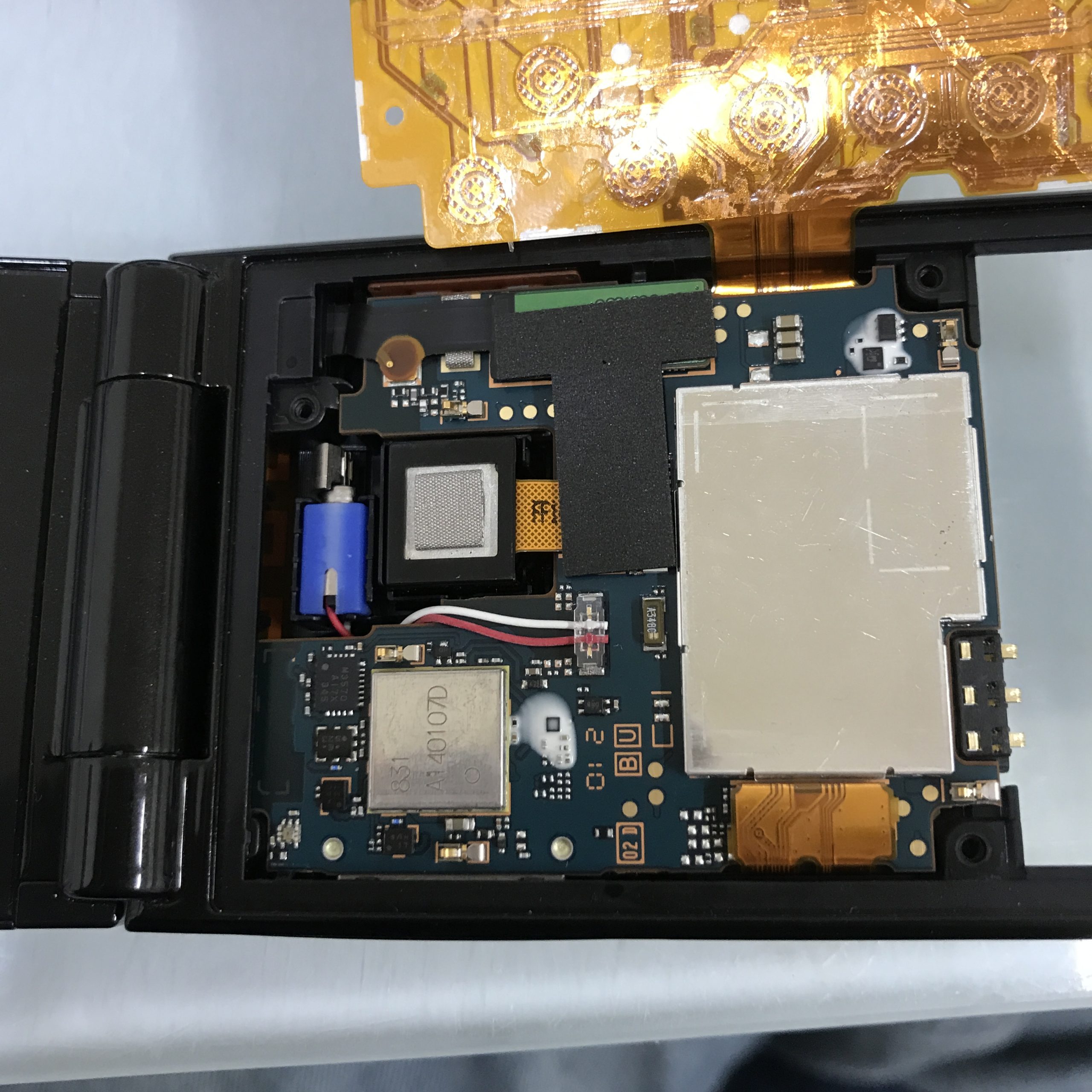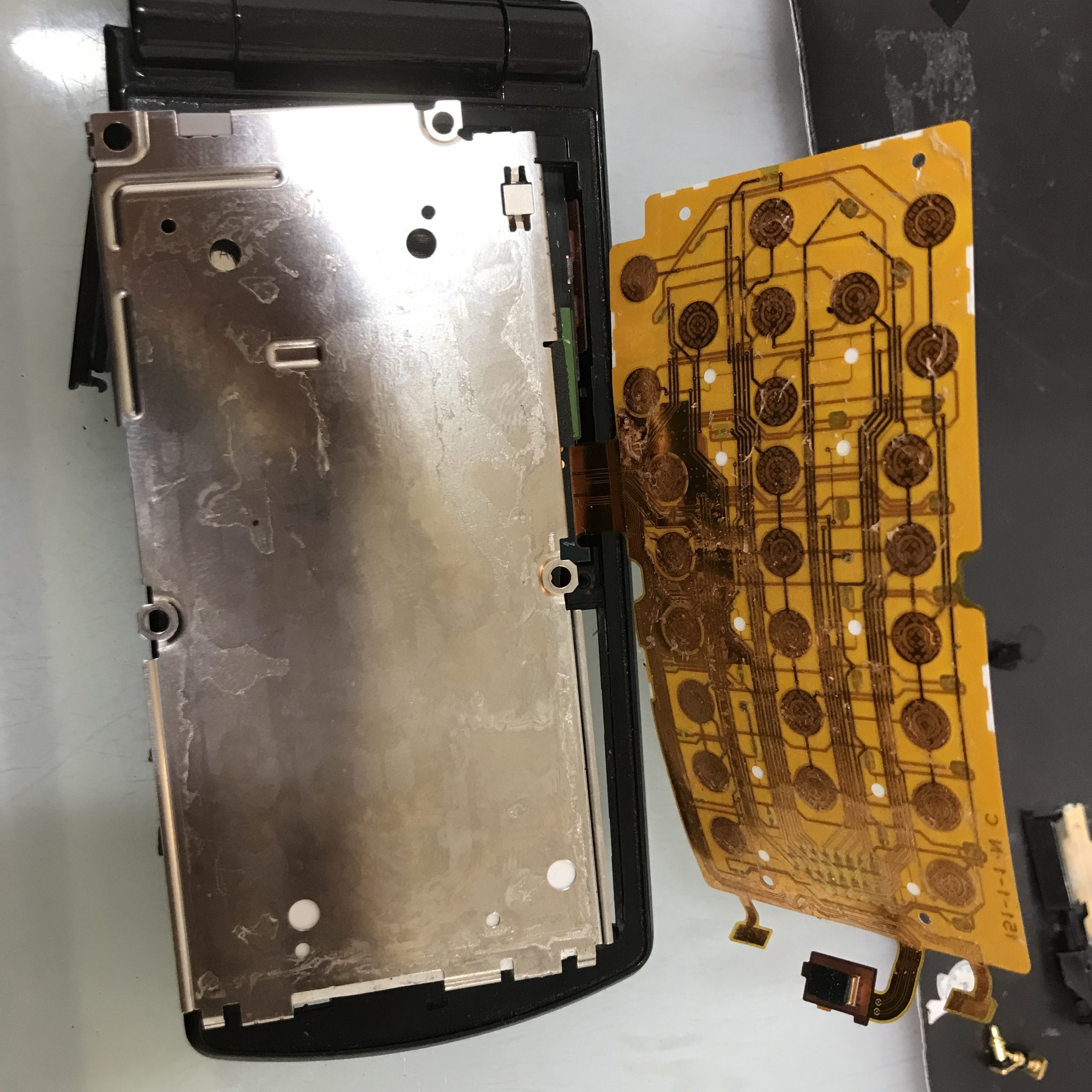 スマホには存在しないキーボタン部分をべりっと剥がしていきます。この裏に、実は基板と呼ばれる機会の脳みそ部分が存在します。この部分が一番重要で、ピンセットなどで傷つけてしまうと最悪起動しなくなる場合もあります。一番注意が必要な個所です。