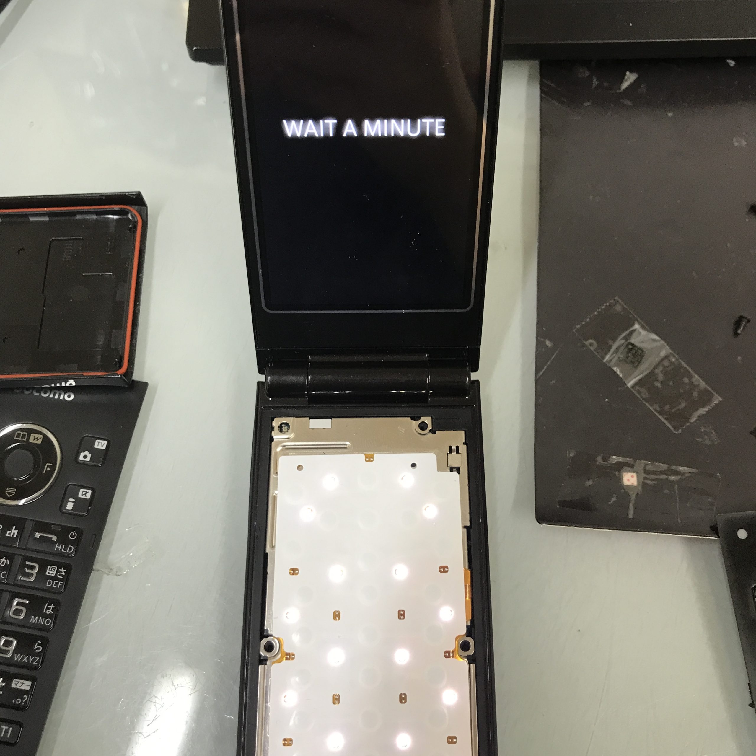 浮かび上がる液晶の文字!画面が無事に表示されるということは、無事に修理復旧成功という証です。以上の検証結果から、今回のN-01Fのガラケーは液晶が破損していたという結果が判明します。