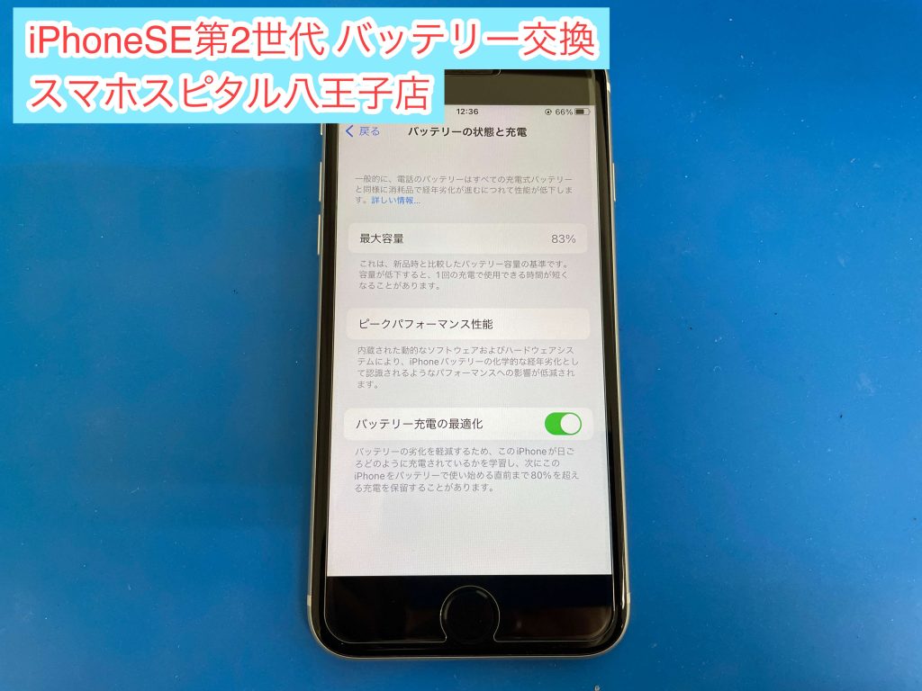 そんなお客様のiPhone SE (第2世代)は下の写真のようにバッテリーの最大容量が低下していて83%になっています。