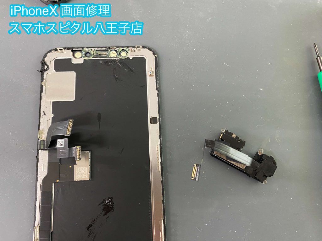 画面に取り付いたフロントセンサー、イヤースピーカーパーツを外します。
