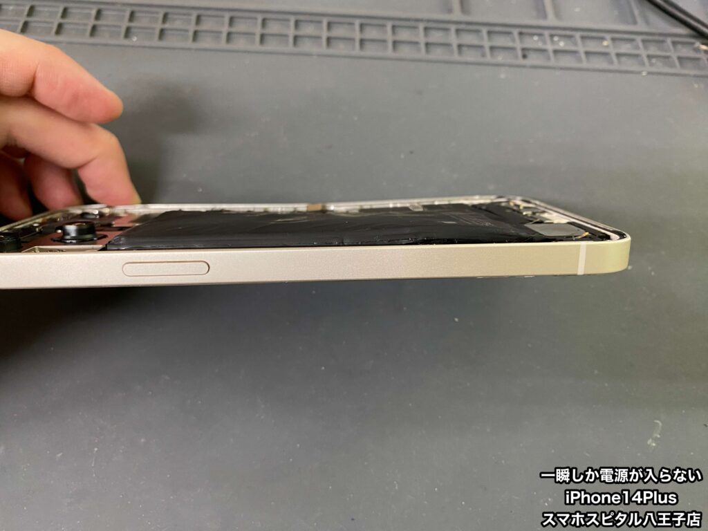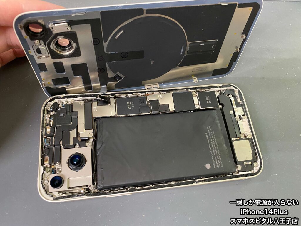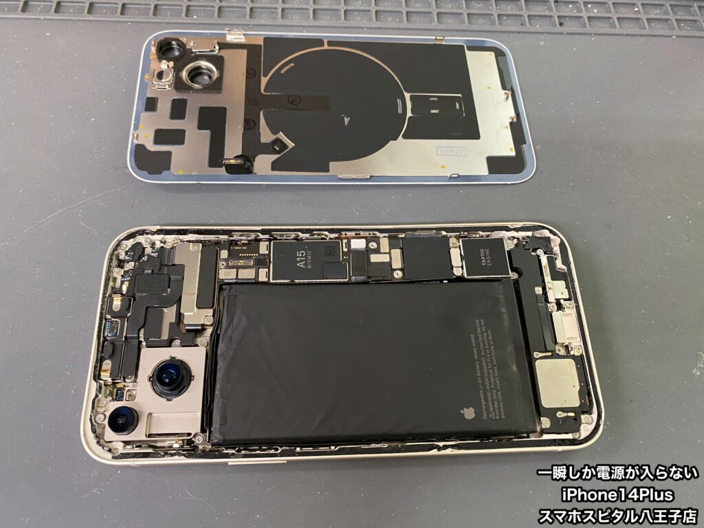 【iPhone14Plus 修理 八王子】急に電源が一瞬しか入らなくなった。ご予約なしでも大丈夫です!!飛び込み修理大歓迎!!