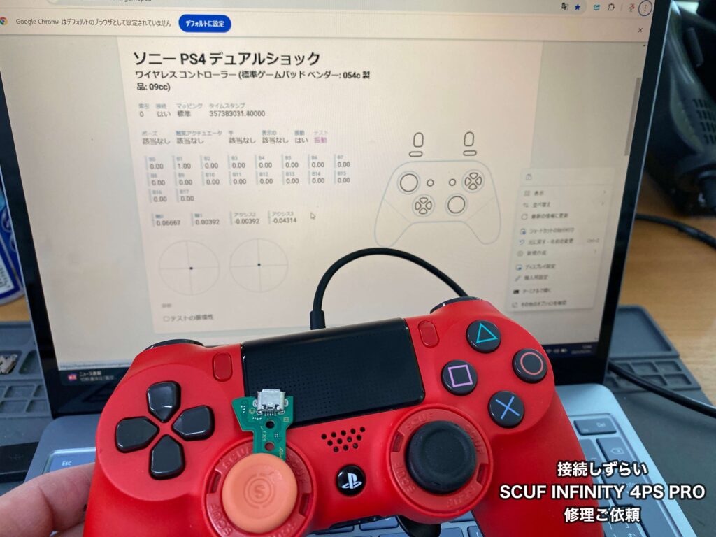 角度も付けてみましたが反応がなく、SCUF INFINITY 4PS PROは充電口の交換修理を行なっていきます!!