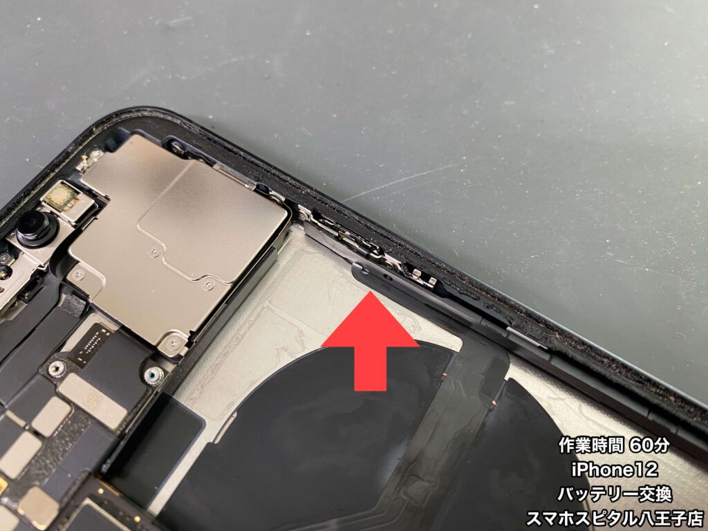 バッテリーを固定しているシールも固く、右上には「スリープボタンケーブル」があるので分解時には注意が必要!!
