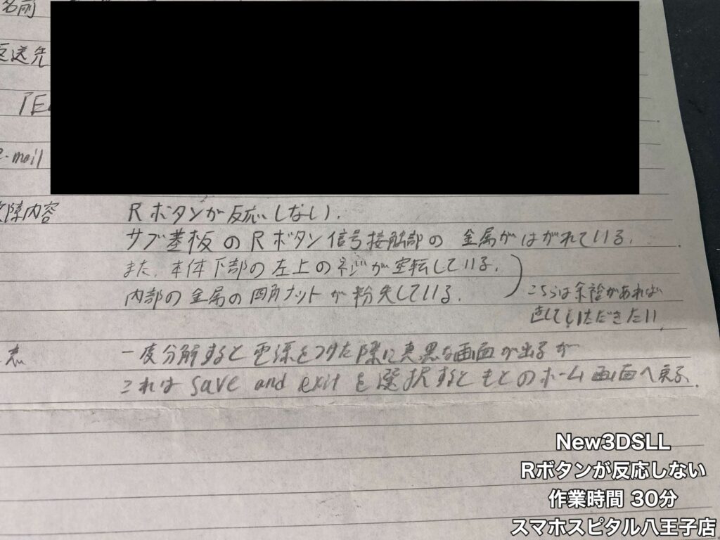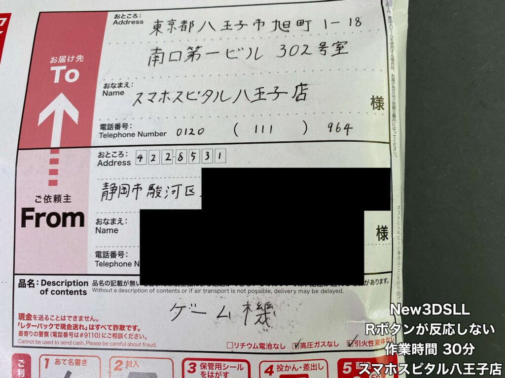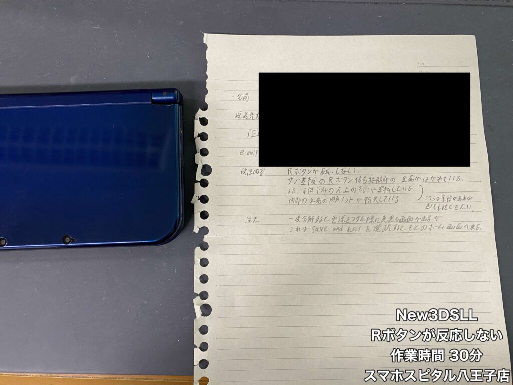 【New3DSLL 郵送修理】静岡からのご依頼。Rボタンケーブルの端子がショート!?修理のご相談はスマホスピタル八王子店へ!!