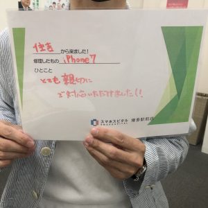 iPhone7の画面交換! とても親切にご対応いただけました! ~スタッフから一言~ 2度目のご来店いただきました! ご満足いただけて本当に嬉しく思います! スマホスピタル博多駅前店は実はリピーター様も多いんですよ(*^^*)