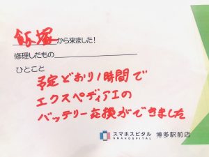 予定通り1時間でエクスペディアⅠ(Xperia 1)のバッテリー交換が出来ました スタッフより 飯塚から車でご来店のお客様。 以前は1時間で10%ほど減っていたのに、最近は同じ使い方でも30%以上バッテリーが減るようになっていたそうです。 3時間で充電が必要になるのはやはり使いにくいですよね。 バッテリー交換したのでまた以前のように使えるはずです!