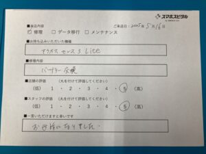 スマホスピタル 浜松 AQUOSsense3liteのバッテリー交換を依頼されたお客様からお声をいただきました。