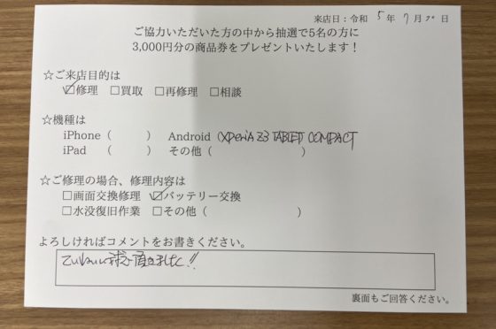 Xperia Z3Tablet Compactのバッテリー交換したお客様よりお声を頂きました。