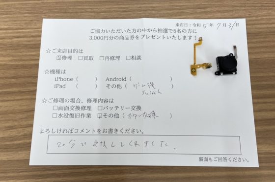 Switch ジョイコン修理のご依頼されたお客様よりお声を頂きました。