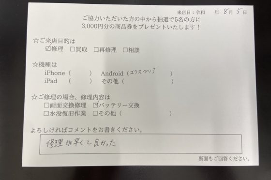 Xperia X Performanceのバッテリー交換したお客様よりお声を頂きました。