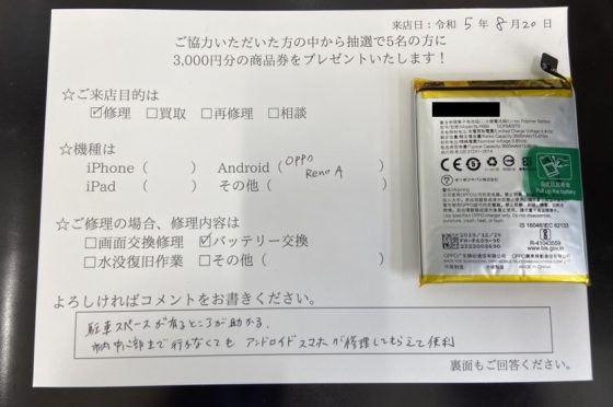 OPPO RenoA のバッテリー交換修理のご依頼されたお客様よりお声を頂きました。