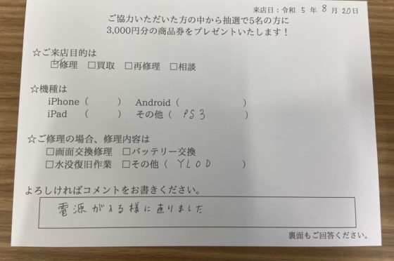 PS3のYLOD修理のご依頼されたお客様よりお声を頂きました。