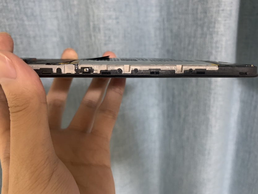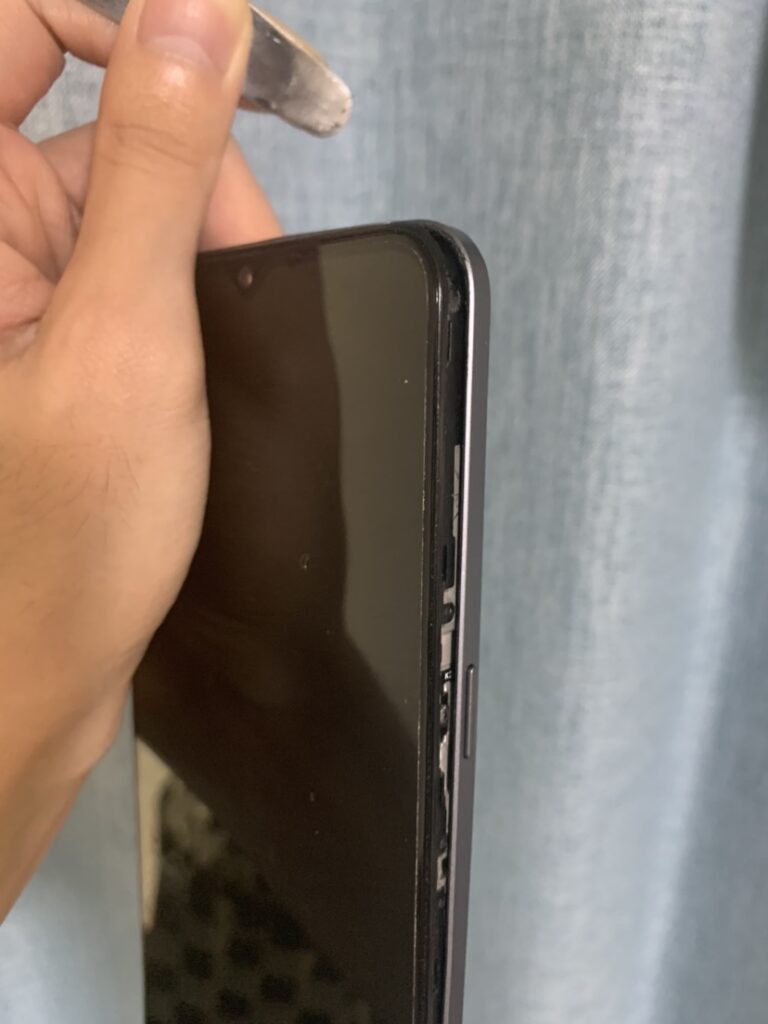 画面のガラス部分の周りにあるベゼル(黒い枠)のすぐ下に隙間があるので、スパチュラなど薄い金属を入れます。