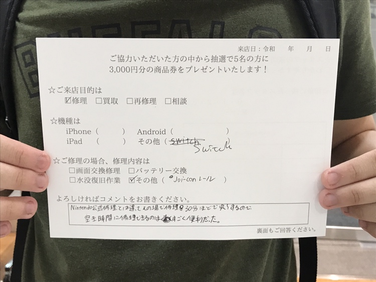 Nintendo公式修理とは違ってその場で修理30ほどで完了するので、空き時間に修理できるのはすごく便利だった。