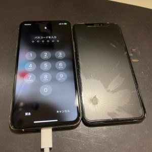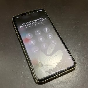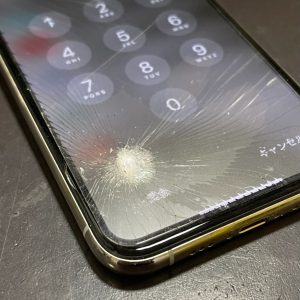 弾丸を受けたかのように割れたiPhone11pro画面交換修理/交野市私市