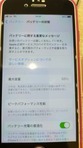 この写真のようにiPhone8のバッテリーの最大容量が68%になってしまい電池の持ち具合が
