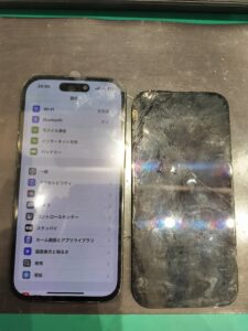 今回お預かりしたのは、落下の衝撃で画面全体が粉々になってしまったiPhone15。