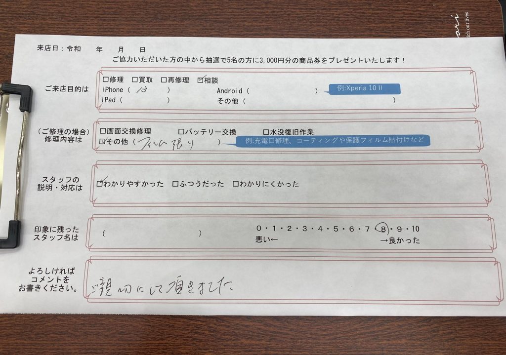 スマホスピタルイオンタウン茨木太田 【お客様の声】iPhone13のフィルム交換をさせていただきました!