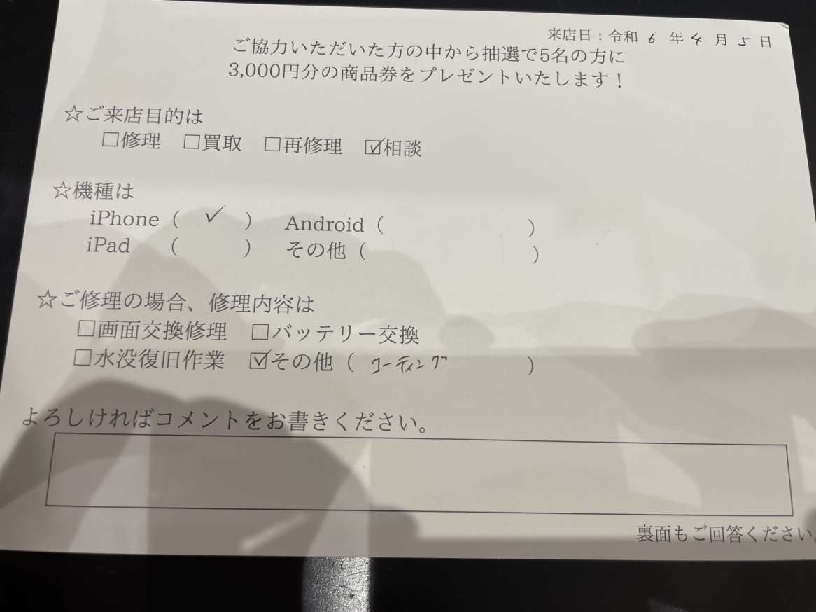 スマホスピタルイオンタウン茨木太田 【お客様の声】iPhoneのガラスコーティングを行ないました。