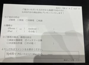 スマホスピタルイオンタウン茨木太田 【お客様の声】iPhone12のバッテリー交換しました!