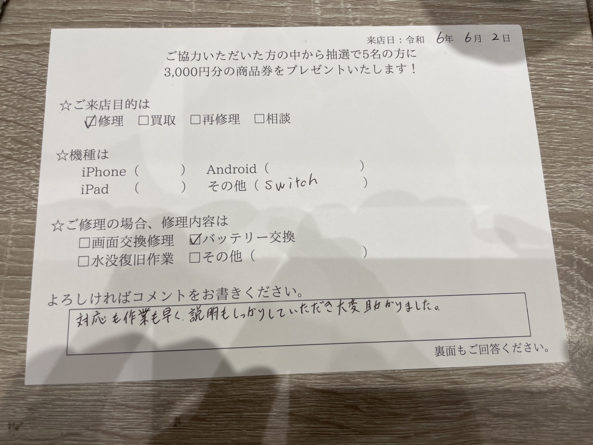 スマホスピタルイオンタウン茨木太田 【お客様の声】Switchのバッテリー交換を行ないました。