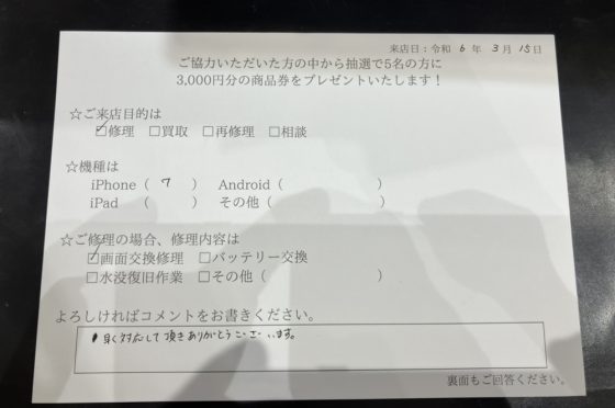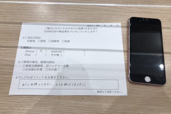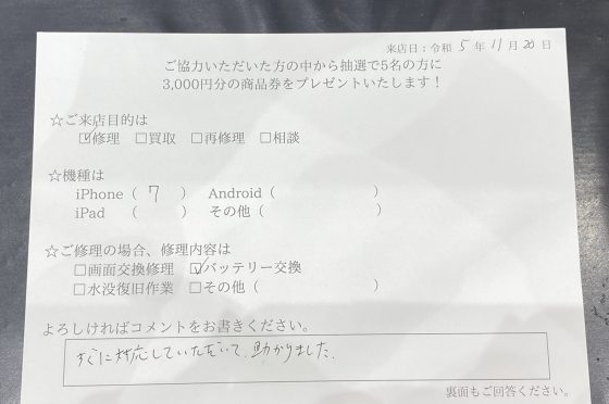 【お客様の声】iPhone7のバッテリー交換をさせていただきました