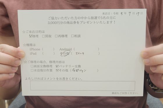 【お客様の声】ニンテンドースイッチの液晶&バッテリー交換をしました!