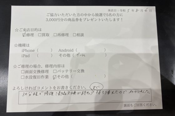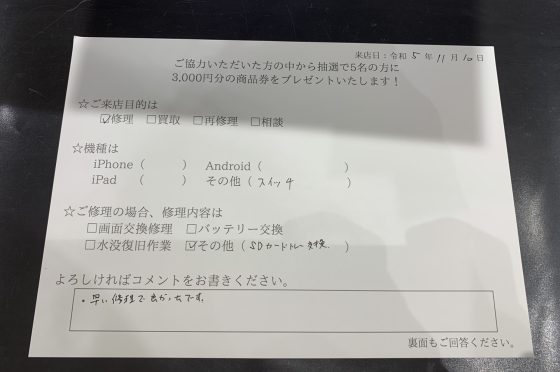 【お客様の声】任天堂SwitchのSDカードスロットを交換しました