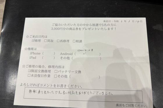 【お客様の声】Xperia 10 Ⅲの画面交換を行いました。