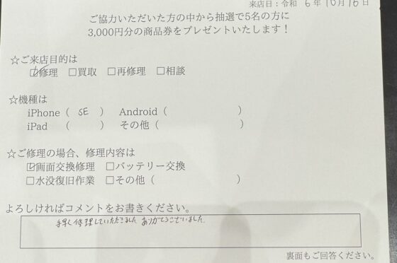 【お客様の声】iPhoneSE(第3世代)画面の交換をしました。