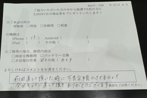 【お客様の声】iPhone13のバックカメラの交換をしました!