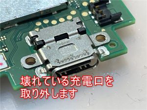 スイッチライトを分解して基板を取り出したら壊れてしまっている充電口パーツを取り外します。