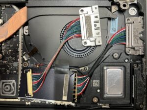 冷却ファンの下にカラフルなコードがありますが、これが充電口のパーツです。
