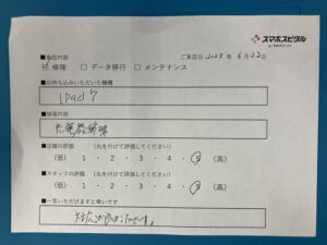 スマホスピタル 神田 iPad第7世代の修理のお客さまよりコメントを頂きました。